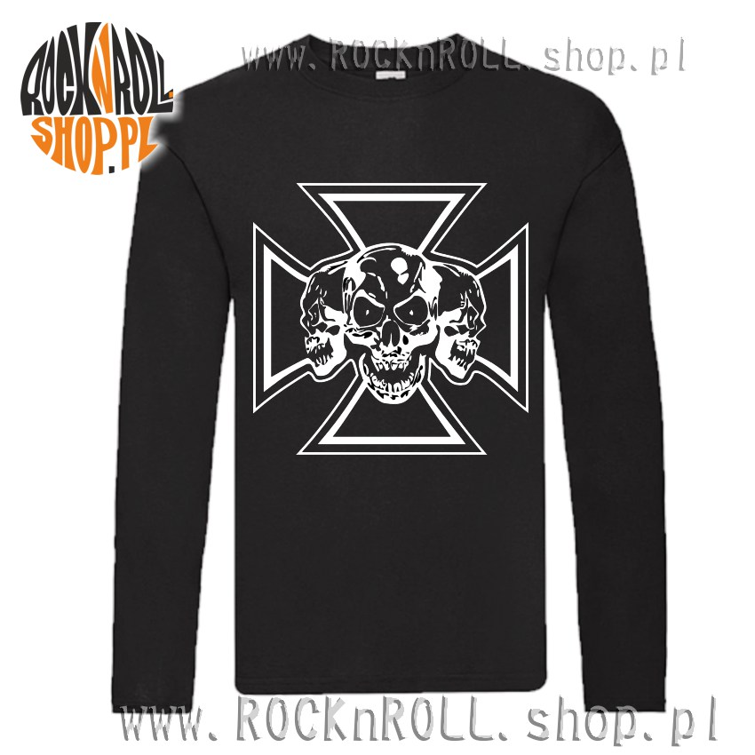 czarny longsleeve z nadrukiem czaszek na tle krzyża.