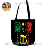 Czarna wygodna i praktyczna torba ekologiczna z trzema "tribalowymi" gitarami w kolorach rasta.