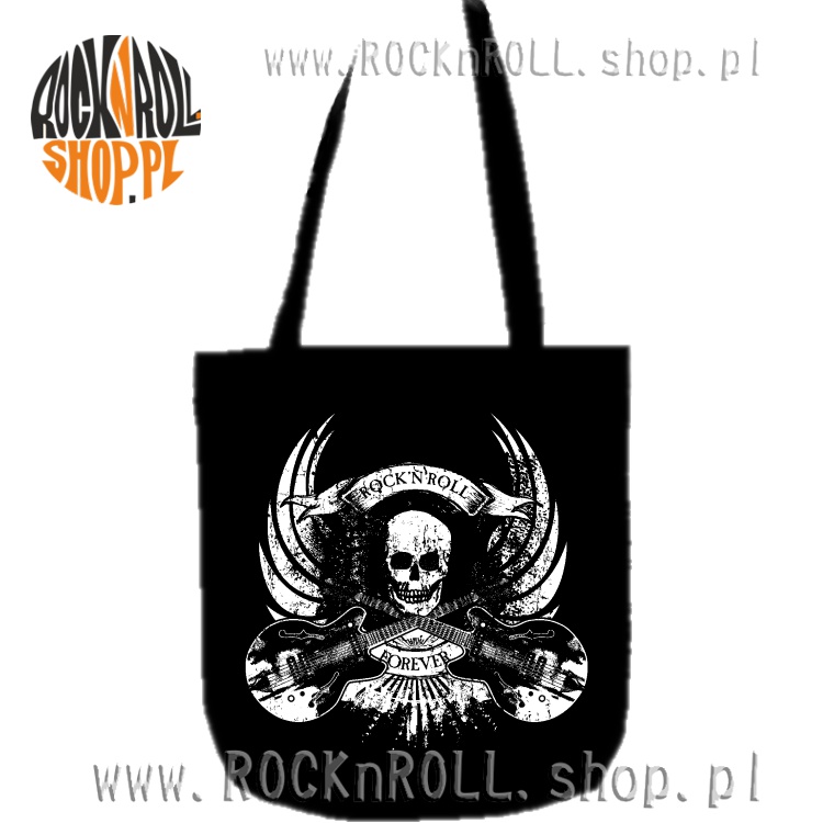 Czarna wygodna i praktyczna torba z nadrukiem wspaniałego hasła Rock n Roll Forever na tle gitar i czachy. Nieśmiertelne.