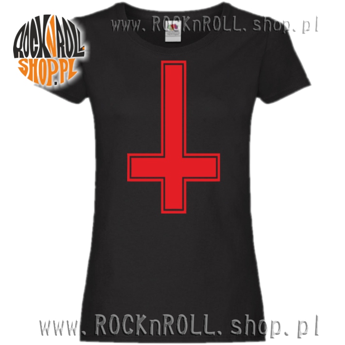 Damski wygodny t-shirt z nadrukiem odwróconego krzyża.