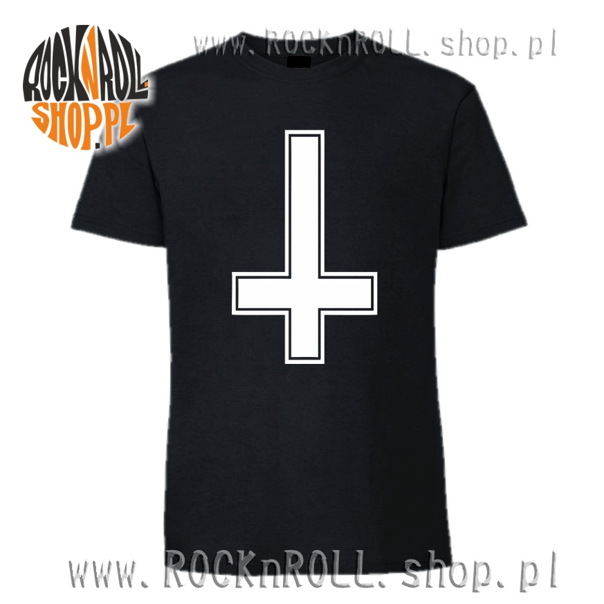 Czarny i wygodny t-shirt z nadrukiem odwróconego krzyża.