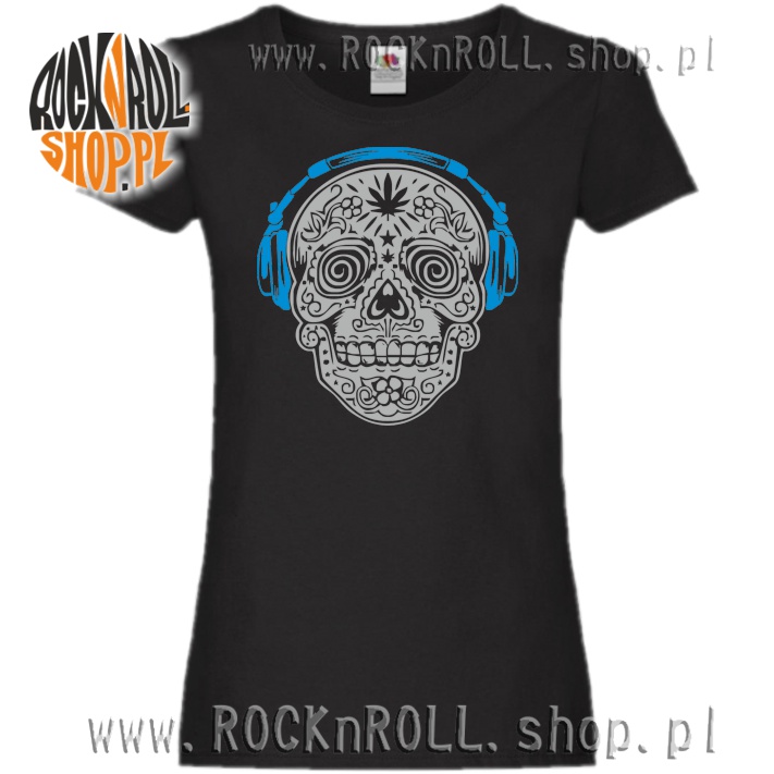 Damski wygodny t-shirt z charakterystycznym nadrukiem rewelacyjnie zdobionej czachy w słuchawkach.