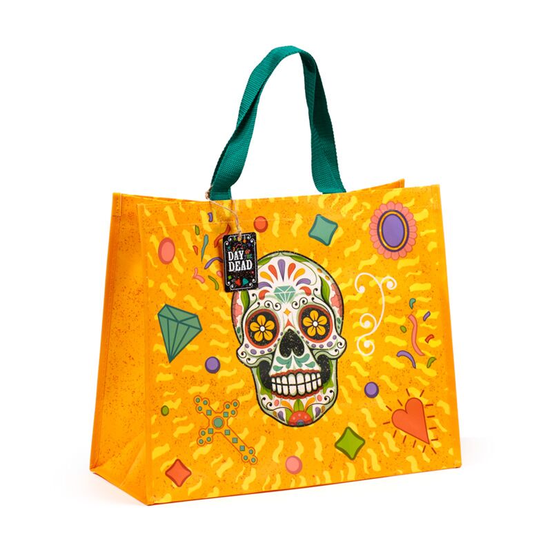 Torba na zakupy wielokrotnego użytku z grafiką meksykańskiego święta zmarłych.