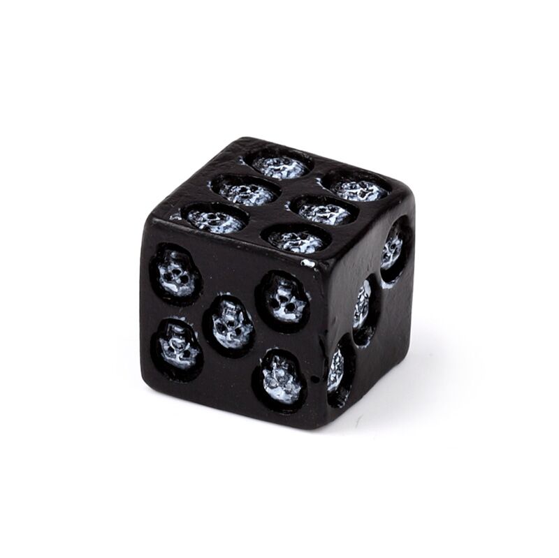 Niesamowite czarne kości do gry, w których zamiast oczek znajdują się bielone czaszki.