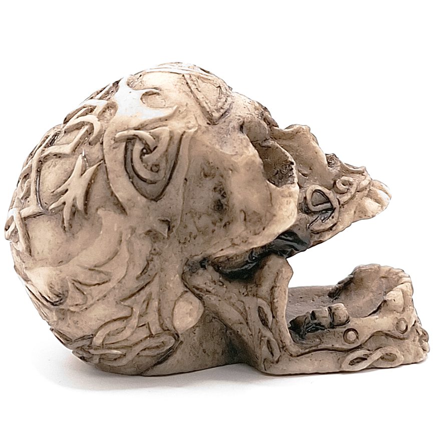 Figurka w kształcie ludzkiej czaszki celtyckimi ornamentami.Czacha jest misternie udekorowana na całej powierzchni ozdobnymi, wypukłymi wzorkami.