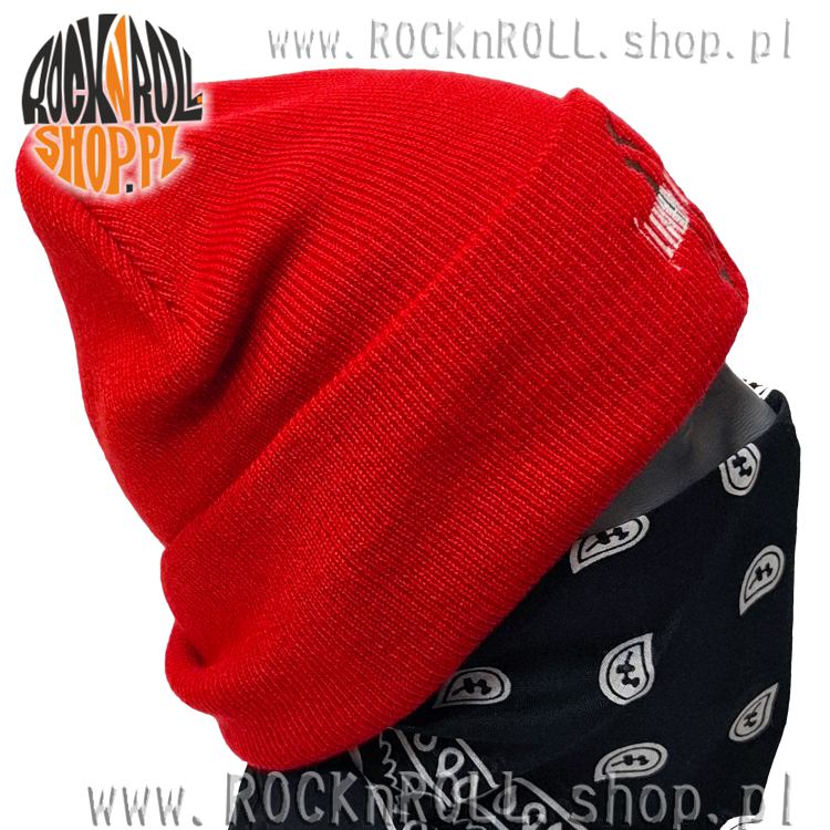 Czerwona, zimowa czapka wykonana z wełny akrylowej, która dobrze dopasowuje się do głowy i zapewnia ciepło.