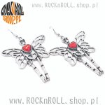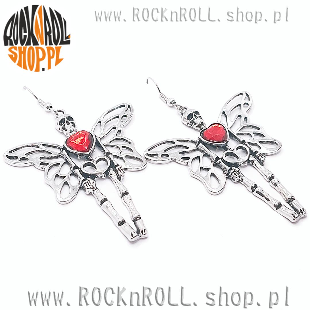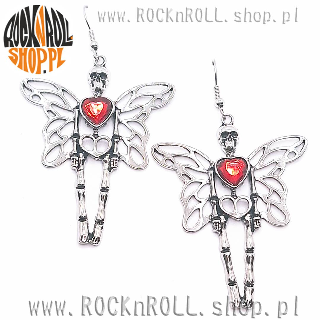 Wyjątkowe kolczyki o mrocznym, artystycznym charakterze, łączące motyw motyla z elementami szkieletu. Ażurowe skrzydła i srebrzysta forma kontrastują z czerwonym, sercowatym zdobieniem, tworząc wyrazisty efekt.