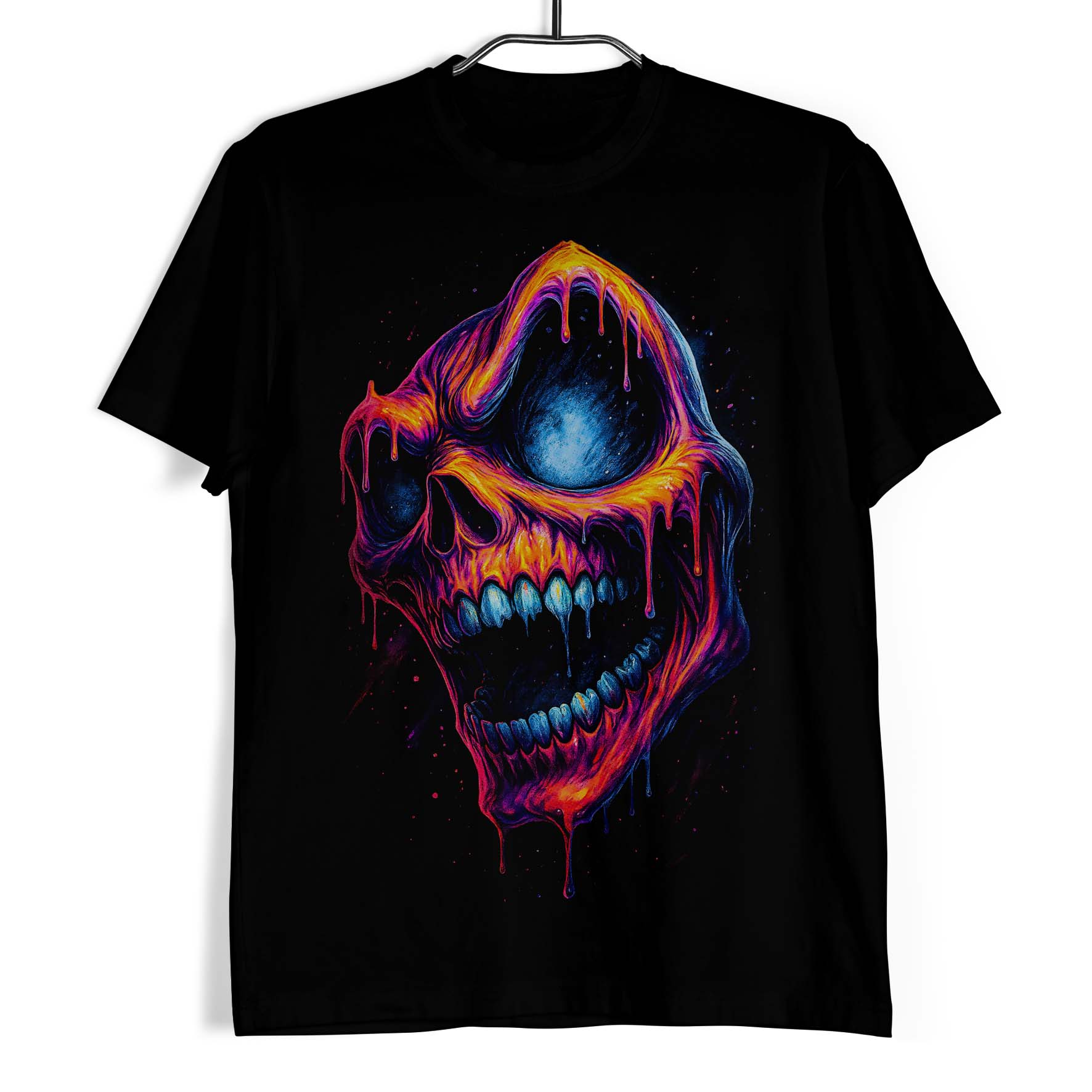 Koszulka męska w kolorze czarnym ze wzorem przedstawiającym szyderczą, kolorową czaszkę.