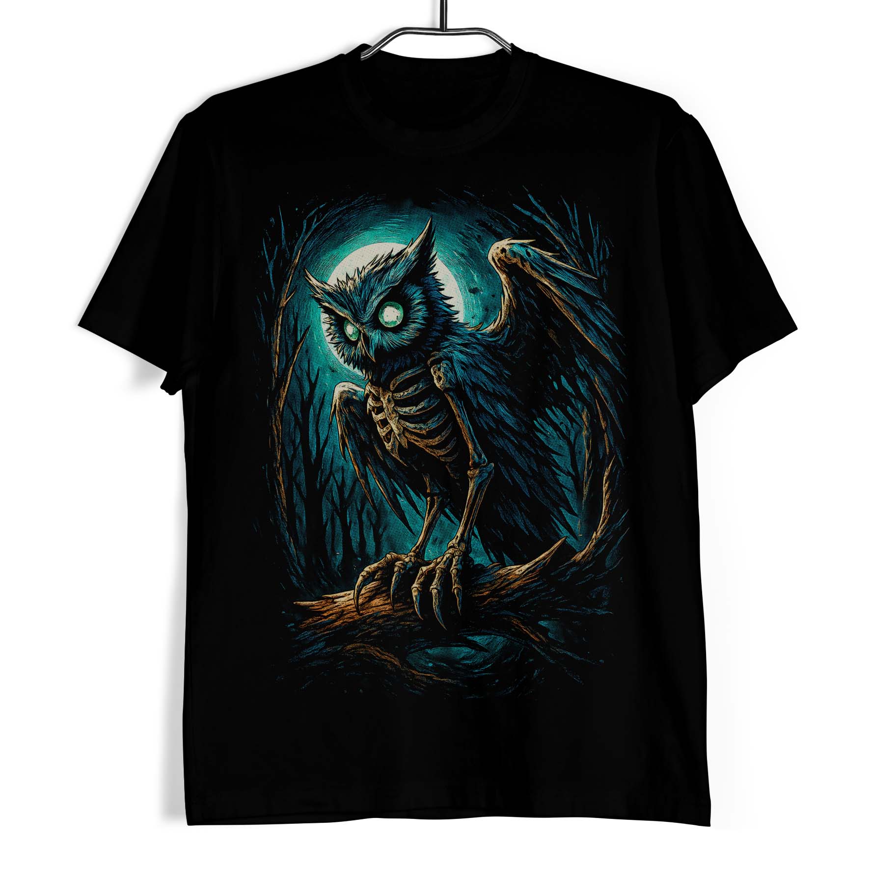 Koszulka męska w kolorze czarnym ze wzorem przedstawiającym mroczną sowę.