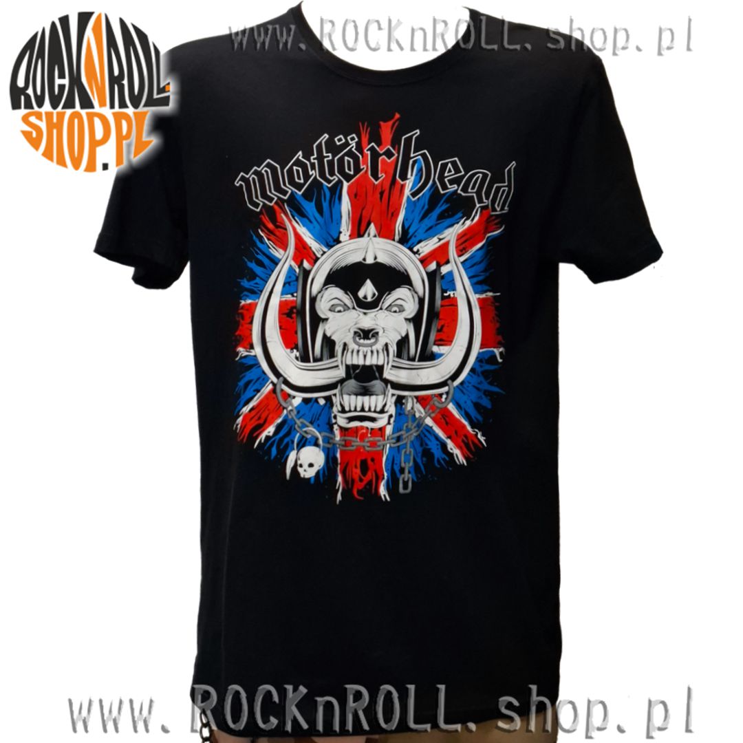 Koszulka z logo zespołu MOTORHEAD na tle brytyjskiej flagi.