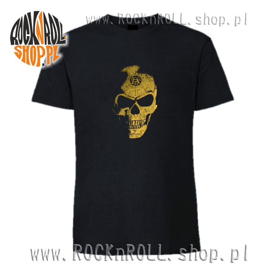 Mroczna czaszka z wyrytymi symbolami wyłania się z mrocznej czerni koszulki.