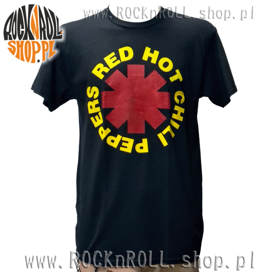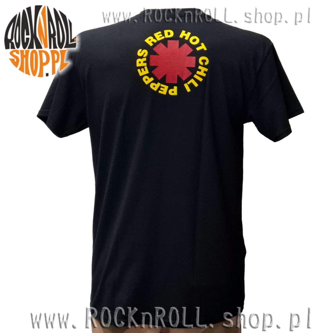 Super czarny t-shirt z logiem popularnej kalifornijskiej grupy muzycznej Red Hot Chili Peppers z gatunku rocka z elementami funku.