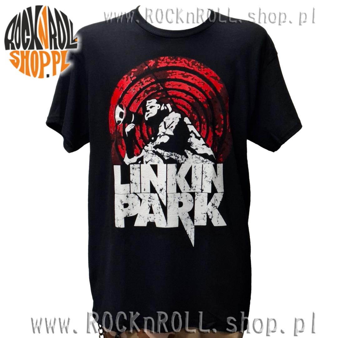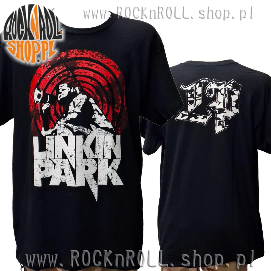 Rewelacyjnie drukowane logo na czarnym t-shirt'cie amerykańskiego nu-metalowego zespołu Linkin Park.
