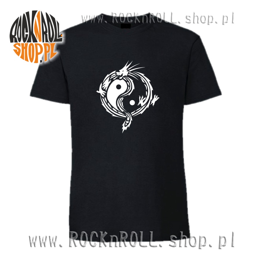 Czarna koszulka z grafiką smoka otaczającego antyczny chiński znak ładu i chaosu Yin Yang.