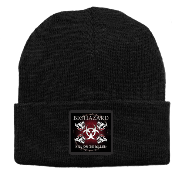 Czapka z wełny akrylowej w kolorze czarnym z nadrukiem zespołu Biohazard.