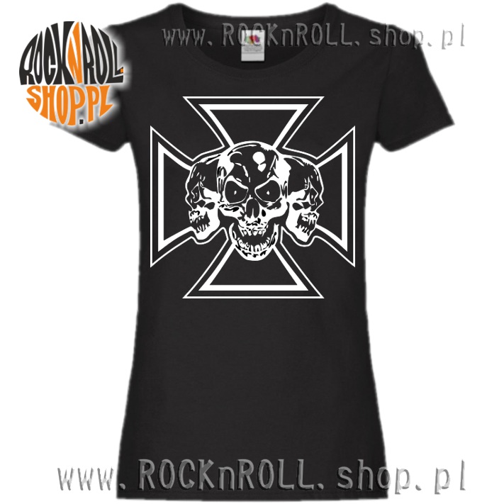 Koszulka damska z czaszkami na tle krzyża.