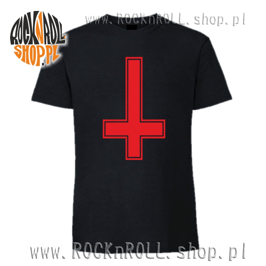 Czarny i wygodny t-shirt z nadrukiem odwróconego krzyża.