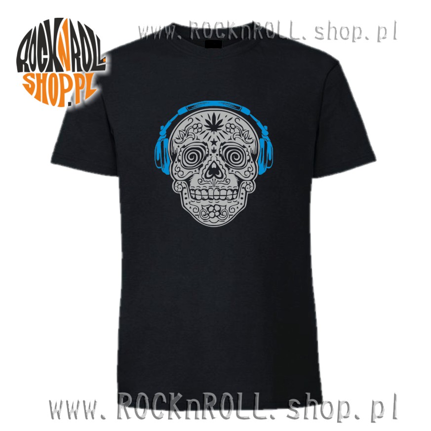 Czarny i wygodny t-shirt z charakterystycznym nadrukiem rewelacyjnie zdobionej czachy w słuchawkach.