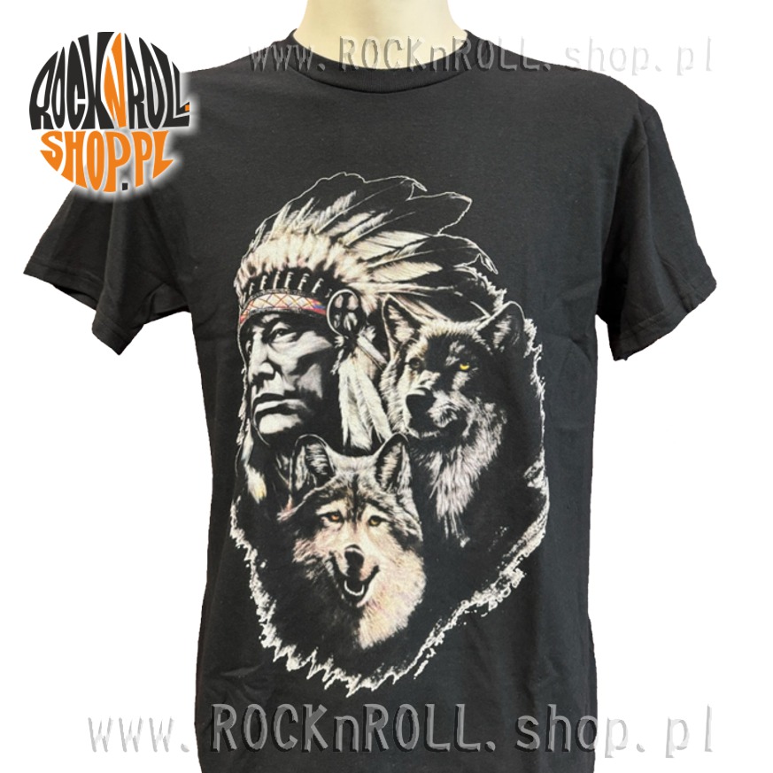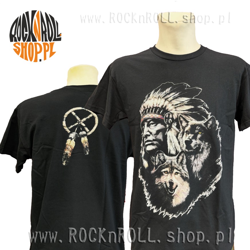 Na przedniej stronie widnieje duża, szczegółowa grafika przedstawiająca mężczyznę w pióropuszu w towarzystwie dwóch wilków.