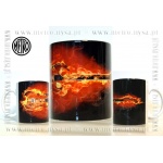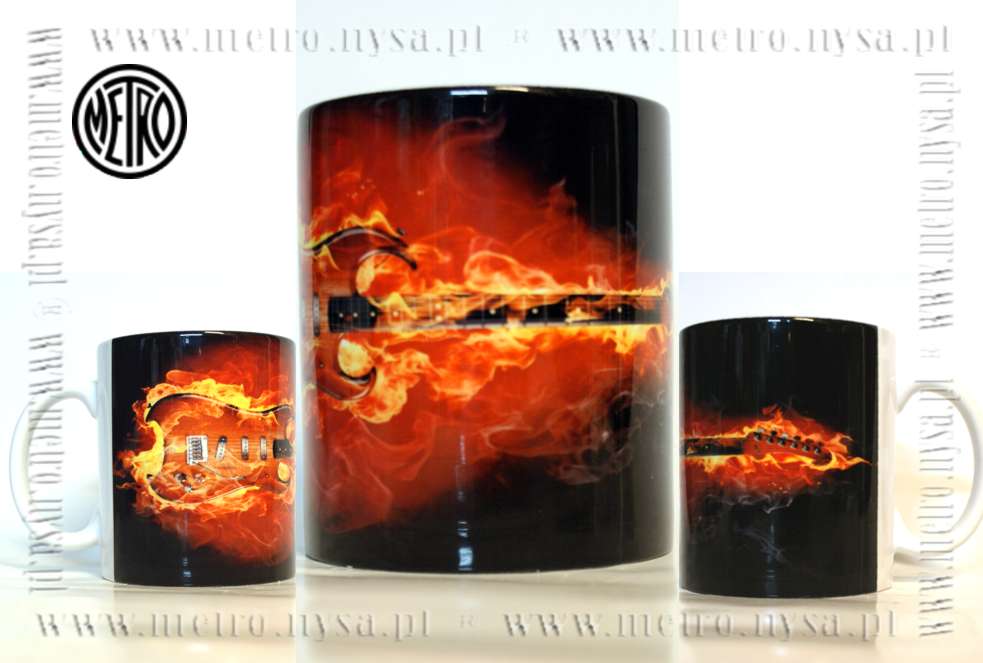 Starannie wykonany kubek z grafiką przedstawiającą płonącą gitarę.