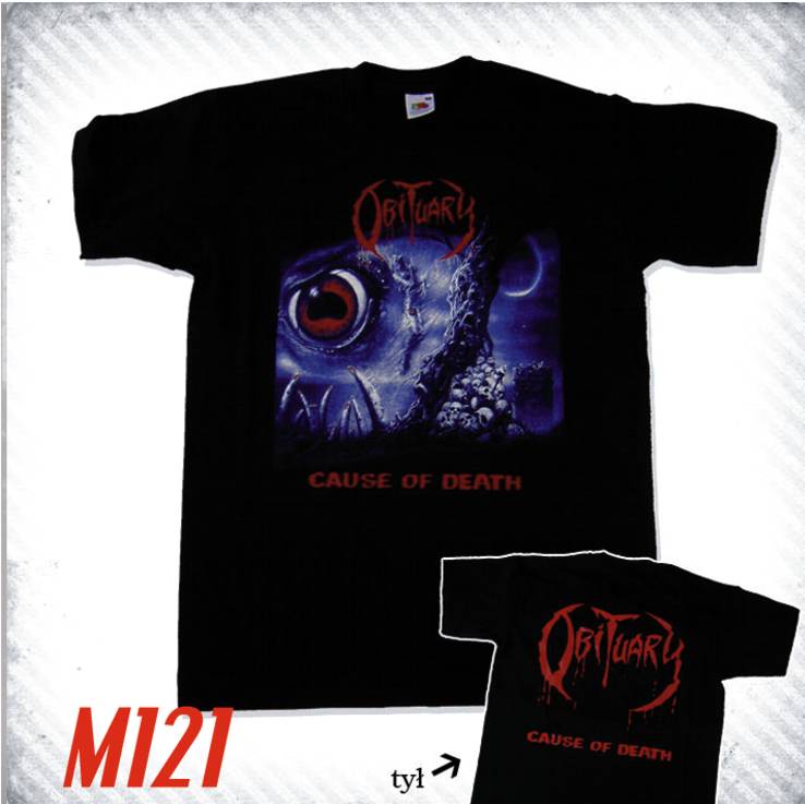 Koszulka z okładką drugiego albumu amerykańskiej grupy Obituary - Cause of Death. Z tyłu widoczne jest logo zespołu wraz z tytułem płyty.