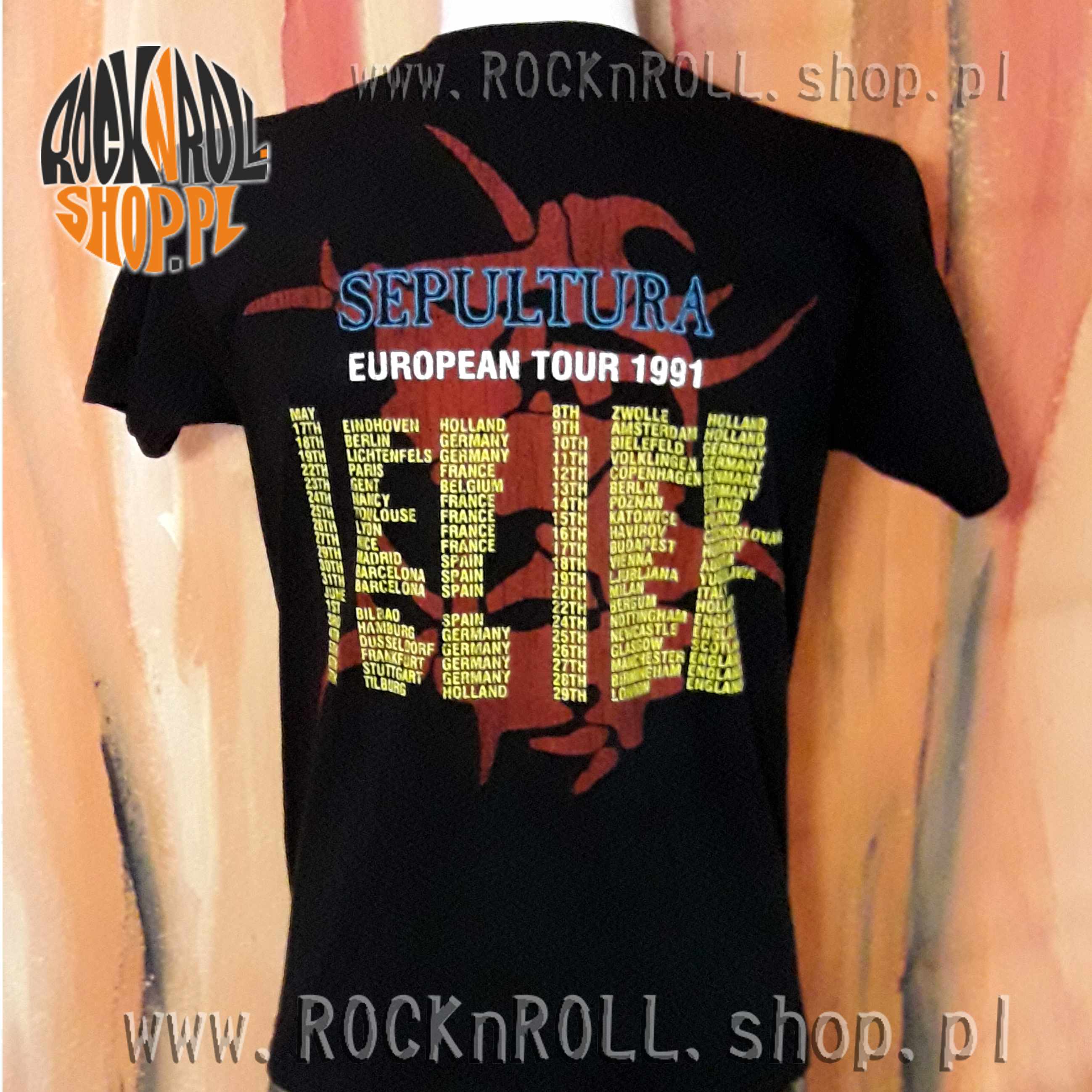 Koszulka z okładką płyty "Arise" brazylijskiej grupy Sepultura. Z tyłu widoczna jest grafika trasy European Tour z 1991 roku