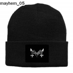 Czapka z wełny akrylowej w kolorze czarnym z grafiką   loga Mayhem – norweska grupa muzyczna wykonująca black metal, zaliczana do prekursorów gatunku