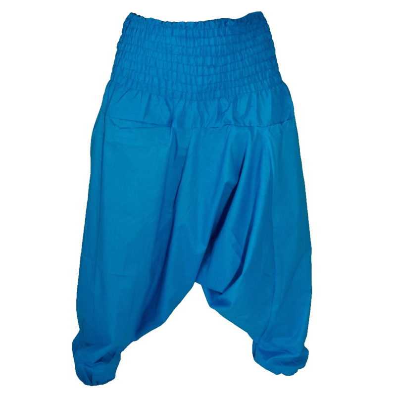 Spodnie szarawary z szerokim ściągaczem na biodrach w kolorze niebieskim.