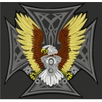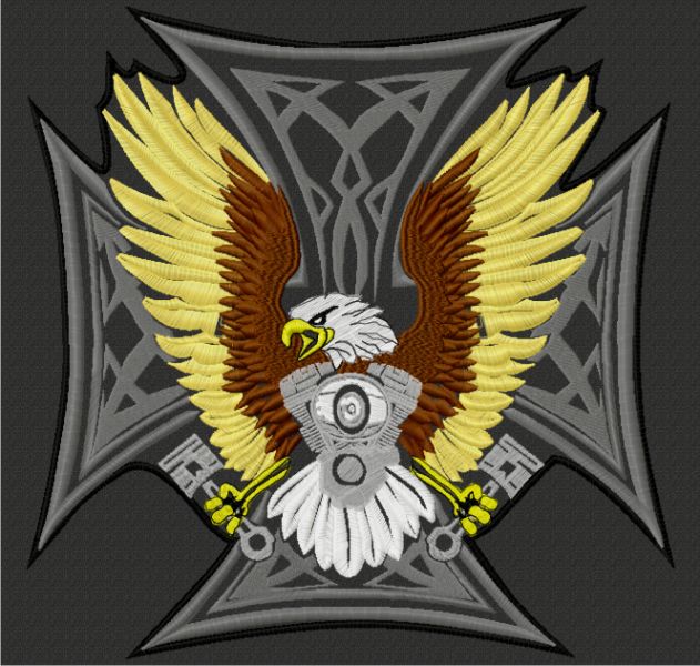Haftowany ekran z orłem na tle krzyża motocyklowego. Orzeł trzyma tłoki, a jego korpus jest zastąpiony silnikiem V2