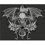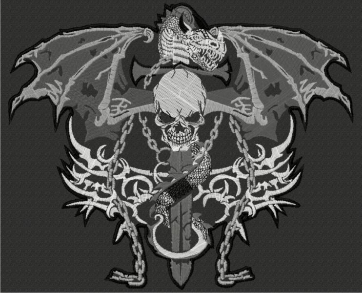 Haftowany ekran rodem z D&D -  Skrzydlata czaszka i miecz, po którym wspina się smok