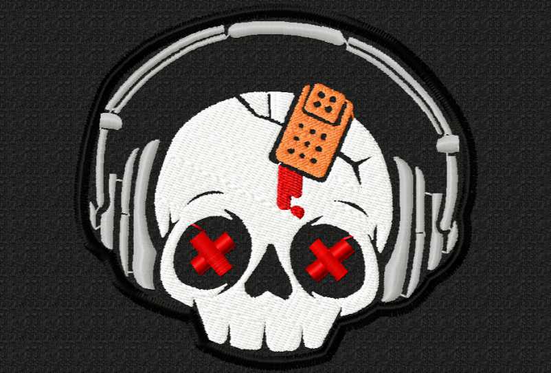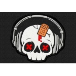 Grafika przedstawia zabawną czaszkę w słuchawkach
