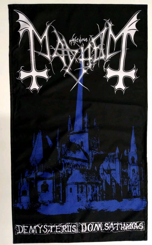 Flaga norweskiej grupy Mayhem wykonującej black metal. Flaga obrazuje pierwsze wydawnictwo grupy pt. De Mysteriis Dom Sathanas.