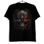 Koszulka męska w kolorze czarnym ze wzworem czaszki biomechanicznnej. Na nadruku znajduje się widoczna mechaniczna kompozycja czaszki wraz z dwukolorowymi, świecącymi oczami w odcieniach czerwieni i niebieskiego, na czole czaszki są czerwone lasery. W tle przdtawione są przewody, które w idealny sposób komponują się z całym wzorem koszulki.