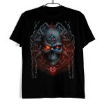 Koszulka męska w kolorze czarnym ze wzworem emblematu satanistycznej czaszki. Na nadruku znajduje się widoczna kompozycja czaszki w ciepłych barwach. W tle przedtawione są łańcuchy, które oplatają widoczną kompozycję.