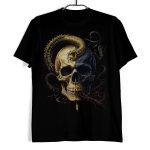 Koszulka męska w kolorze czarnym ze wzorem czaszki wraz wężami. Na nadruku znajduje się widoczna kompozycja czaszki w ciepłych oraz chłodnych barwach. Idealna dla fanów tych jedwabistych istot.