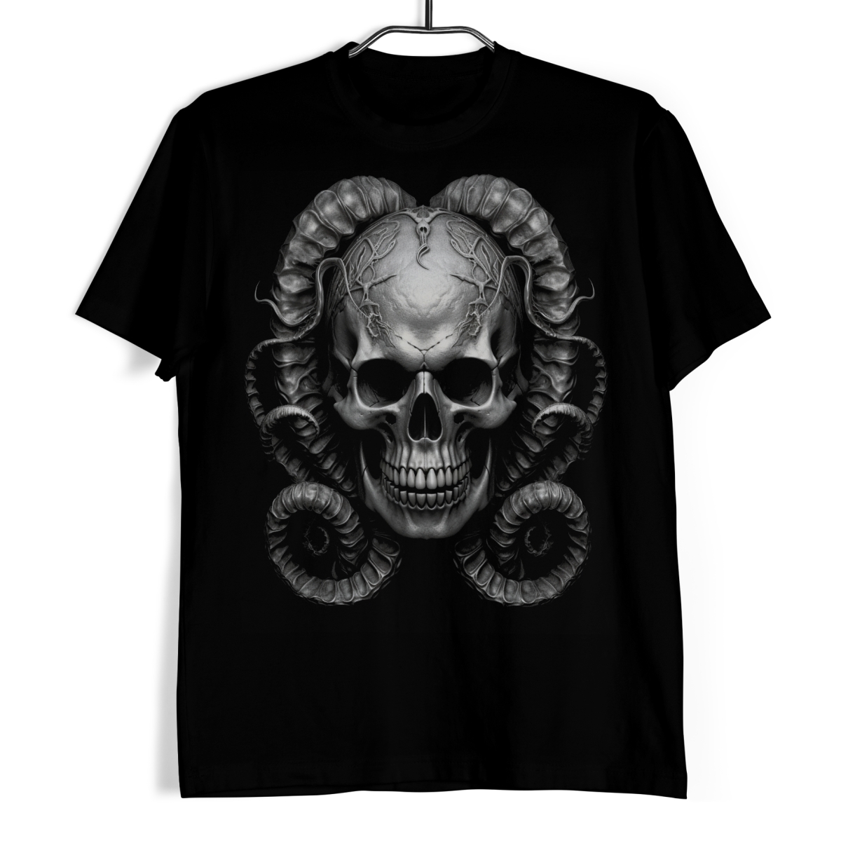Koszulka męska w kolorze czarnym z nadrukiem czaszki z baranimi rogami. Spodoba się każdemu baranowi.