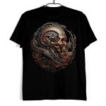 Koszulka męska w kolorze czarnym z nadrukiem czaszki wśród metalowego świata.