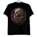 Koszulka męska w kolorze czarnym ze wzworem czaszki biomechanicznnej. Na nadruku znajduje się widoczna mechaniczna kompozycja czaszki.