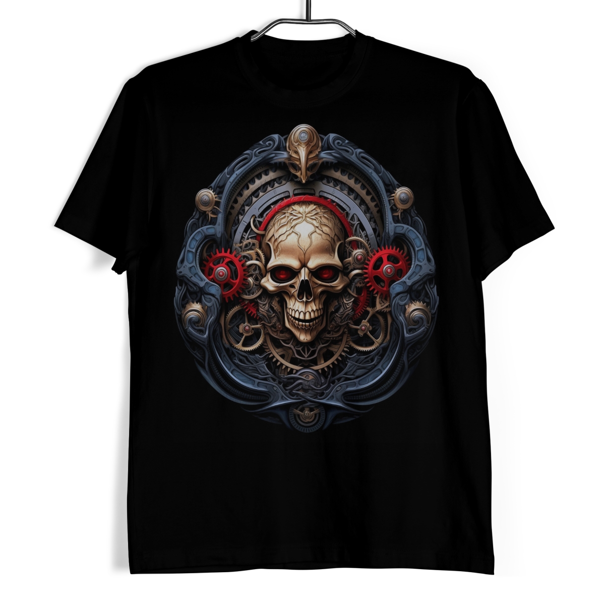 Koszulka męska w kolorze czarnym ze wzworem czaszki mechanicznnej. Na nadruku znajduje się widoczna mechaniczna kompozycja.