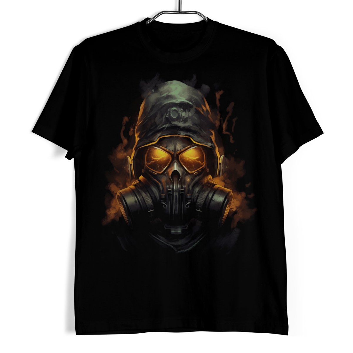 Koszulka męska w kolorze czarnym ze wzorem nuklearnej czaszki wśród gazu w odcieniach żółtego oraz pomarańczowego.