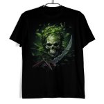 Koszulka męska w kolorze czarnym ze wzorem przedstawiającym czaszkę z narzędziem ostrym w kompozycji w zielonych barwach.