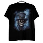 Koszulka męska w kolorze czarnym ze wzorem przedstawiającym arystokracyjnego szkieleta w gotyckim cylindrze wśród płomieni w odcieniach niebieskiego.