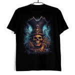 Koszulka męska w kolorze czarnym ze wzorem przedstawiającym nawiedzającego statki pirata palącego się niebieskim ogniem.
