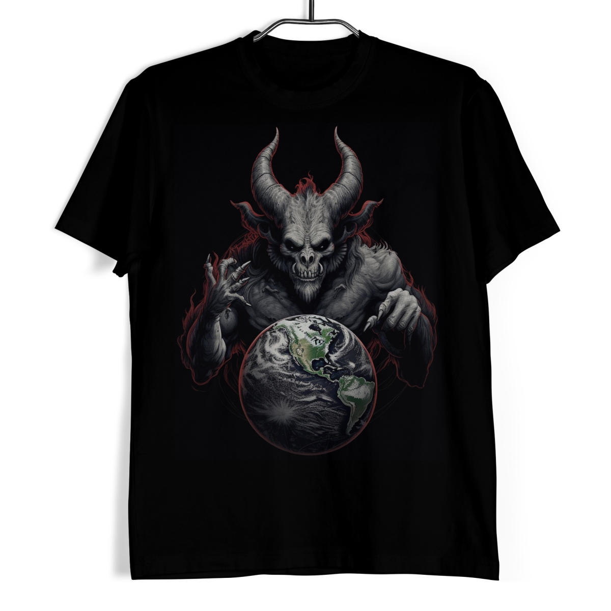 Koszulka męska w kolorze czarnym ze wzorem przedstawiającym postać przypominającą demona z piekieł, który w swych obięciach trzyma świat, a może Ziemię.
