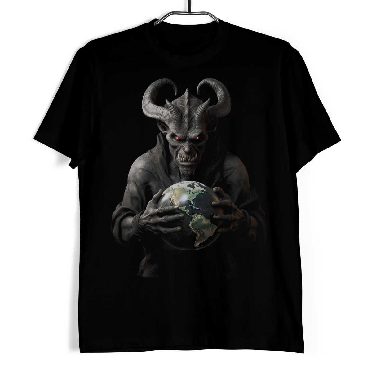 Koszulka męska w kolorze czarnym ze wzorem przedstawiającym postać przypominającą demona z piekieł, który w swych obięciach trzyma globus Ziemii.