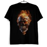 Koszulka męska w kolorze czarnym ze wzorem przedstawiającym czaszkę ,którą pochłania piekielny ogień Lucyfera.