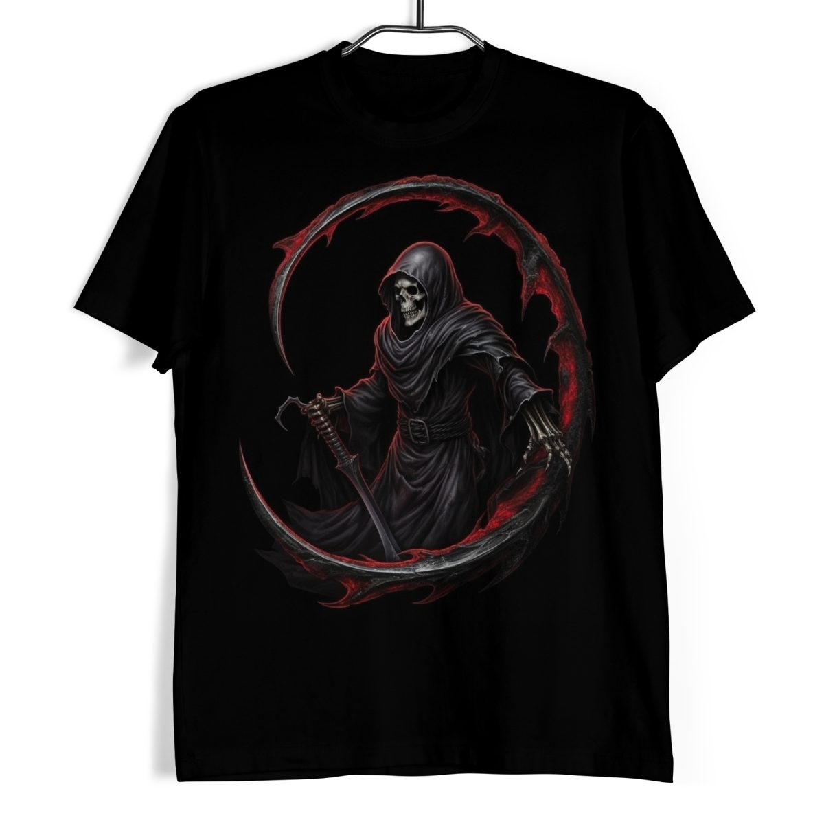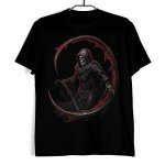 Koszulka męska w kolorze czarnym ze wzorem przedstawiającym martwą śmierć z mieczem w ręce. Kompozycję wypełnia, zakrawiona od ofiar, kosa.