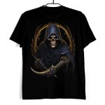 Koszulka męska w kolorze czarnym ze wzorem przedstawiającym upadłego kosiarza z mieczem. W tle znajduje się ornamentowy, złotawy okrąg.