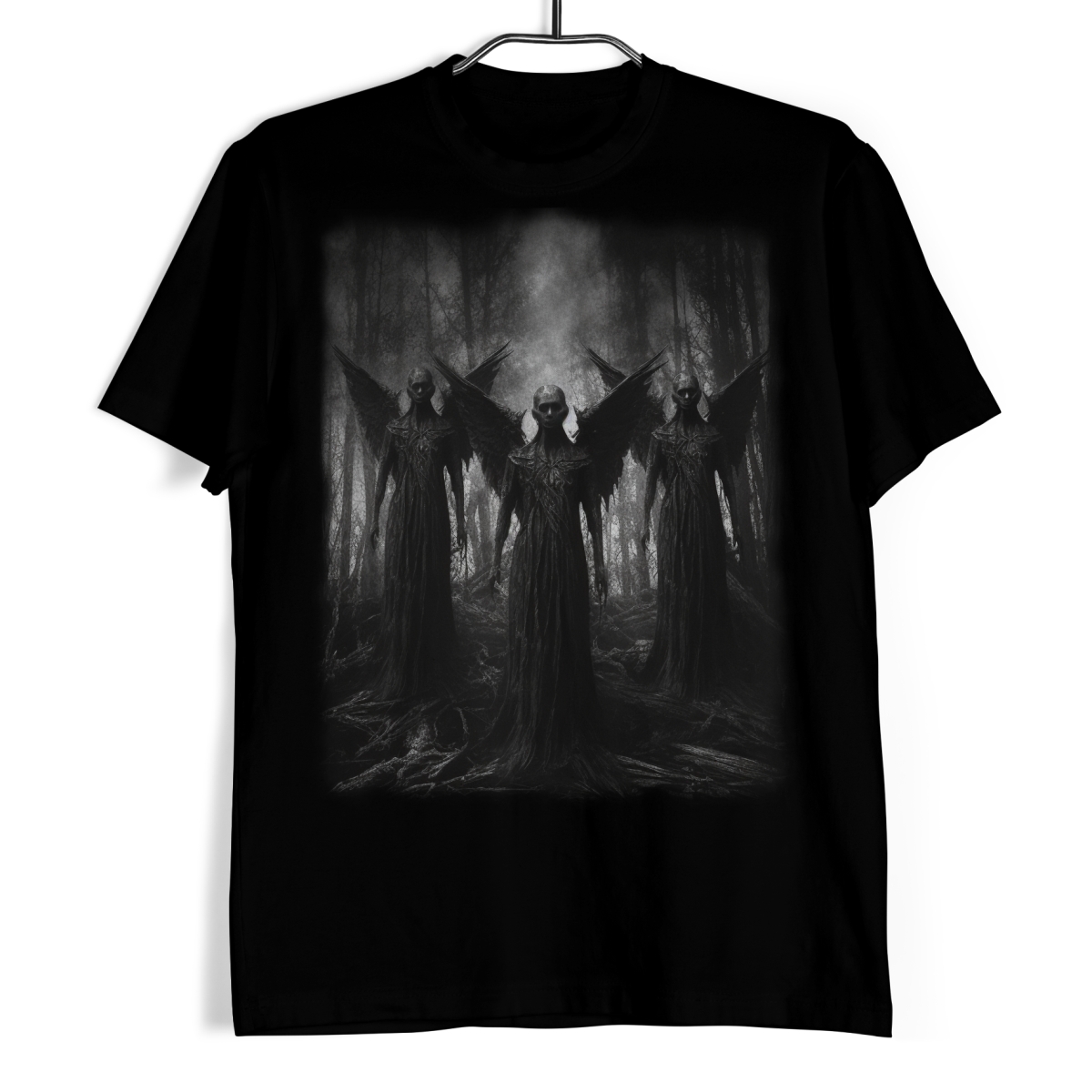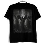 Koszulka męska w kolorze czarnym ze wzorem przedstawiającym postacie niczym wyjęte z piekła ze skrzydłami. Kolorystyka w odcieniach szarości.