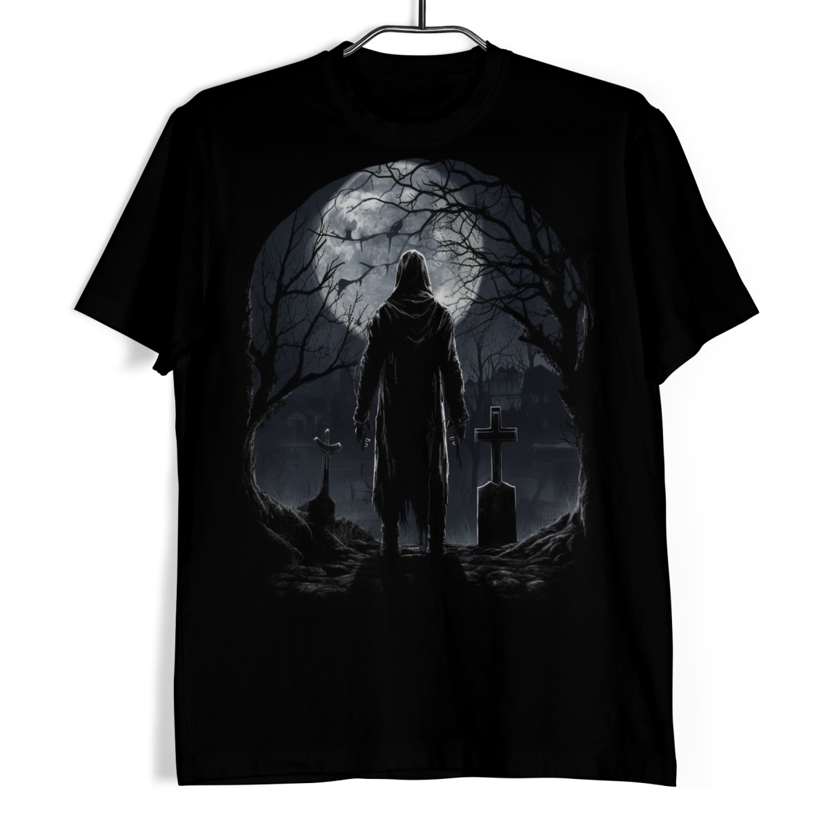 Koszulka męska w kolorze czarnym ze wzorem przedstawiającym zakapturzoną postać na tle, mrożącego krew żyłach, nocnego widoku cmentarza.